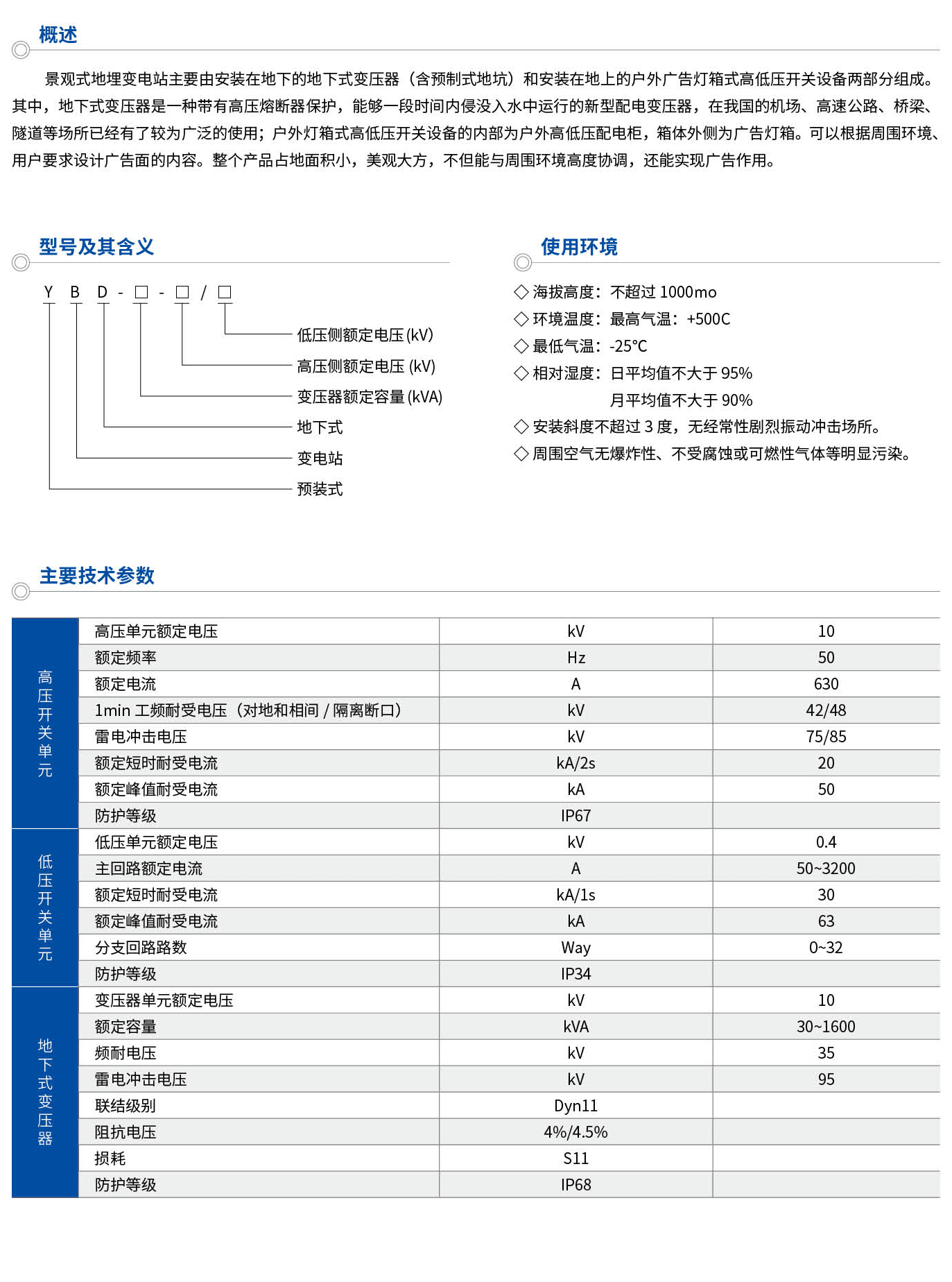 景观式地埋变电站主要由安装在地下的地下式变压器(含预制式地坑)和安装在地上的户外广告灯箱式高低压开关设备两部分组成。其中,地下式变压器是一种带有高压熔断器保护,能够一段时间内侵没入水中运行的新型配电变压器,在我国的机场、高速公路、桥梁、隧道等场所已经有了较为广泛的使用;户外灯箱式高低压开关设备的内部为户外高低压配电柜,箱体外侧为广告灯箱。可以根据周围环境、用户要求设计广告面的内容。整个产品占地面积小,美观大方,不但能与周围环境高度协调,还能实现广告作用。